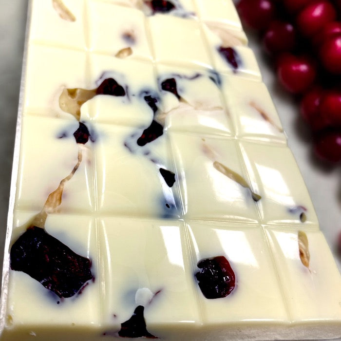 The most delicious Belgian white (fair) chocolate, richly filled with cranberries and freshly roasted almonds. They show themselves beautifully on the top of the bar. Completely handmade in our studio in Reeuwijk.