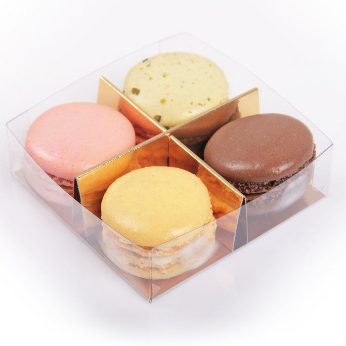 4 macarons de qualité supérieure confectionnés par l'un des meilleurs pâtissiers de France. Nous les emballons dans une belle boîte transparente avec une incrustation dorée. Un cadeau beau et savoureux. Nous les proposons en différentes saveurs. Nous ferons un mélange de citron, café, vanille, chocolat, pistache et framboises. Les macarons ont une bouchée croustillante et deviennent ensuite merveilleusement doux et crémeux.
