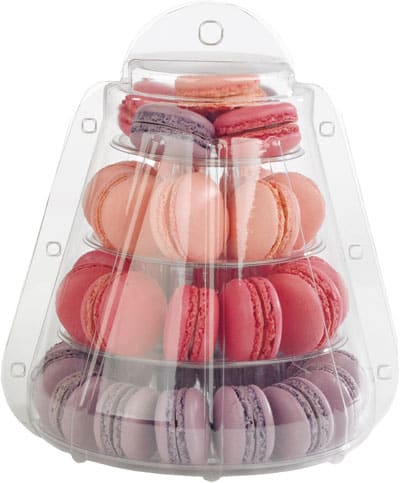 Met verwijderbare plastic verdiepingen. Deze ronde toren met plastic koepel, is perfect voor het presenteren van de heerlijke macarons.