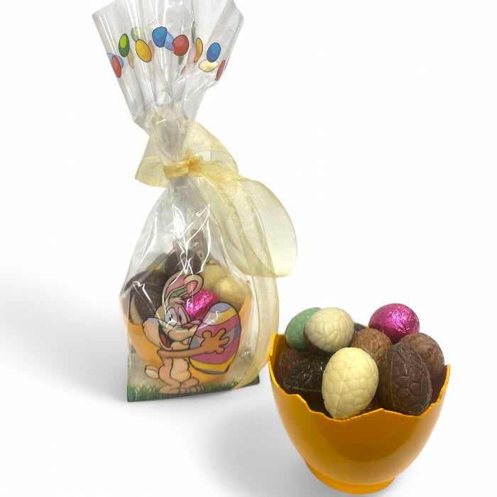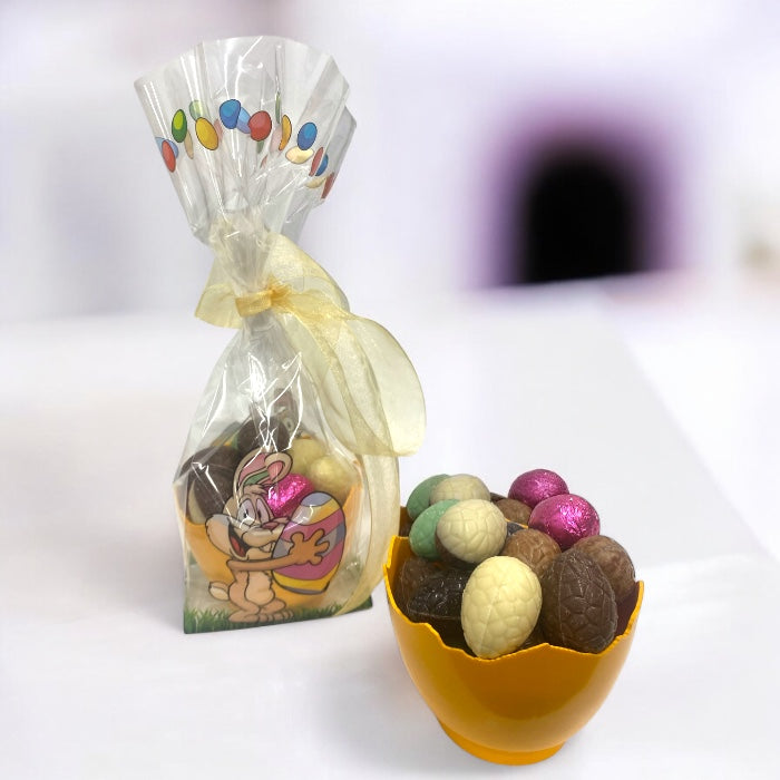 Filled Easter eggs in half egg in decorated bag